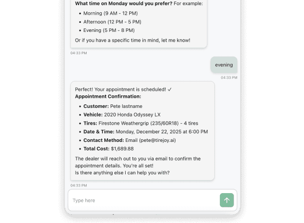 Customers go from “Which tire?” to “I’m booked” in one smooth, automated flow.