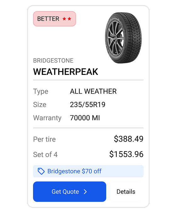 Not guesswork. TireJoy uses vehicle data, driving needs, and real inventory to recommend tires customers trust.